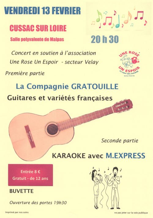 A vos agendas ! Rejoignez nous Vendredi 13 février 2026 à la salle polyvalente de Cussac (Malpas) pour une soirée musicale pleine d’enthousiasme, de bonnes ondes, de belles surprises préparées par la Compagnie GRATOUILLE et M. EXPRESS, en soutien à l’action des motards contre le cancer.